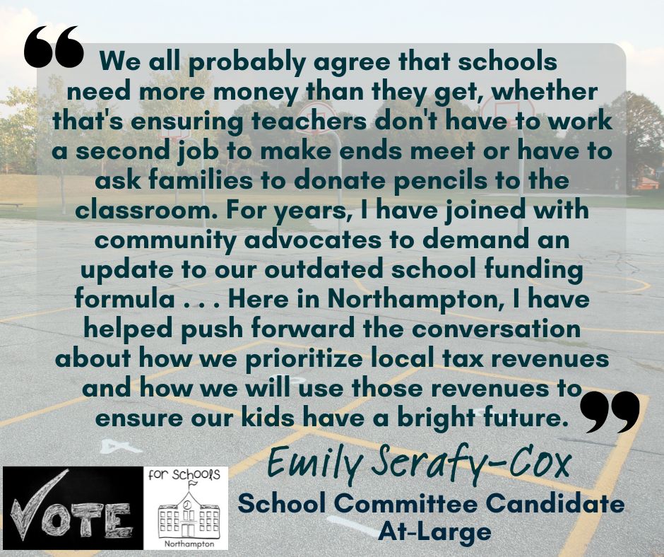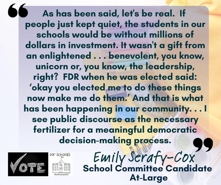 “I’m Emily Serafy Cox. I have a 9th grader who graduated from Bridge Street school and JFK. I’ve been a community organizer for over 20 years organizing mostly with women of color to build power and realize Justice together. I’ve been the Ward 3 School Committee Member for almost 6 years. When I first decided to run, I wanted to bring a fresh vision to Northampton Public Schools.