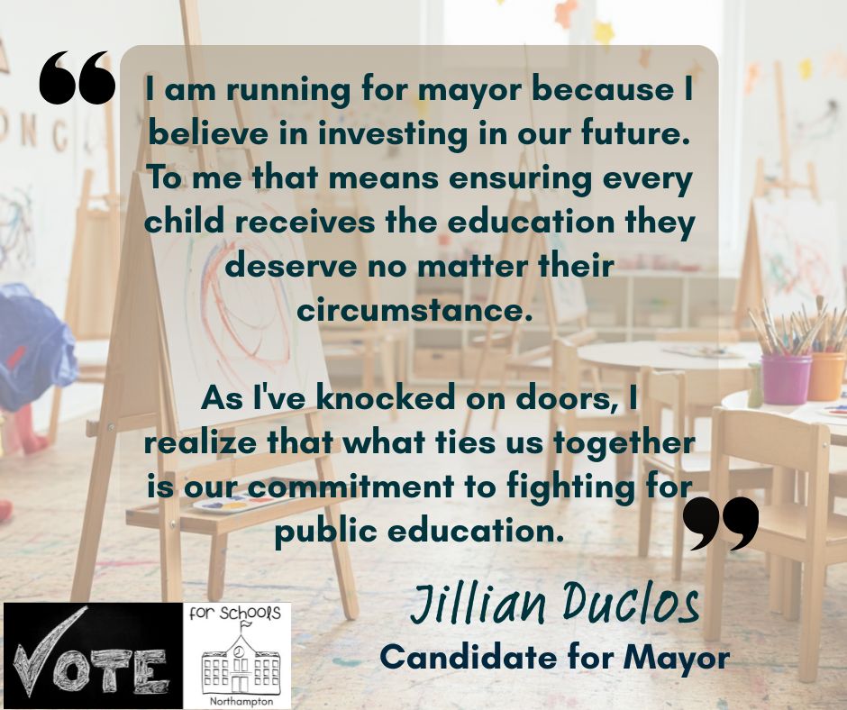 “I am running for mayor because I believe in investing in our future. To me that means ensuring every child receives the education they deserve no matter their circumstance. As I’ve knocked on doors, I realize that what ties us together is our commitment to fighting for public education.