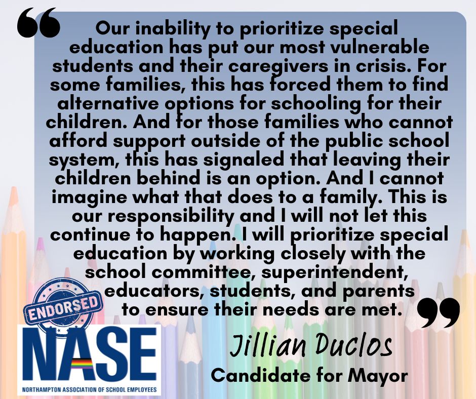 This is our responsibility and I will not let this continue to happen. I will prioritize special education by working closely with the school committee, superintendent, educators, students, and parents to ensure their needs are met.”