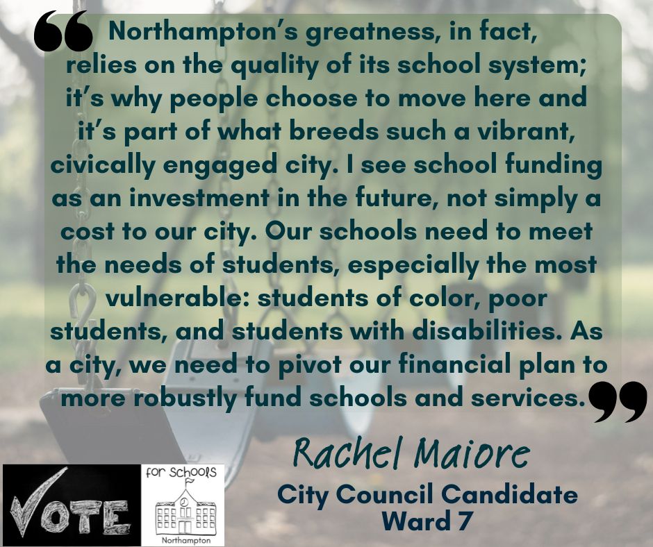 Rachel Maiore has provided numerous statements about funding public schools in her role as Ward 7 City Councilor and City Council Vice President this year. Recordings of her statements are in progress and will be shared on this page.