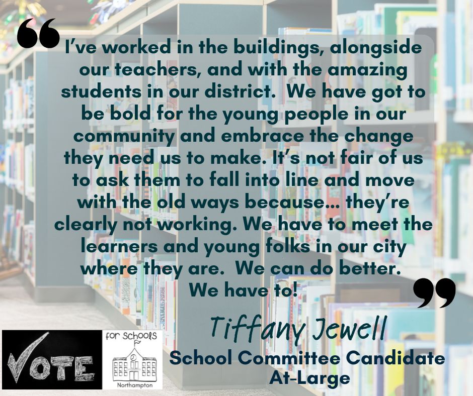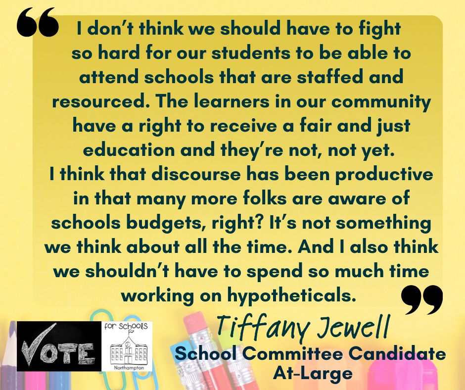 We need to provide inspiring, relevant, and consistent professional development to our teachers and staff and ensure that our students with disabilities are receiving the services that are our responsibility and their right. We want our community to want to stay in Northampton.”